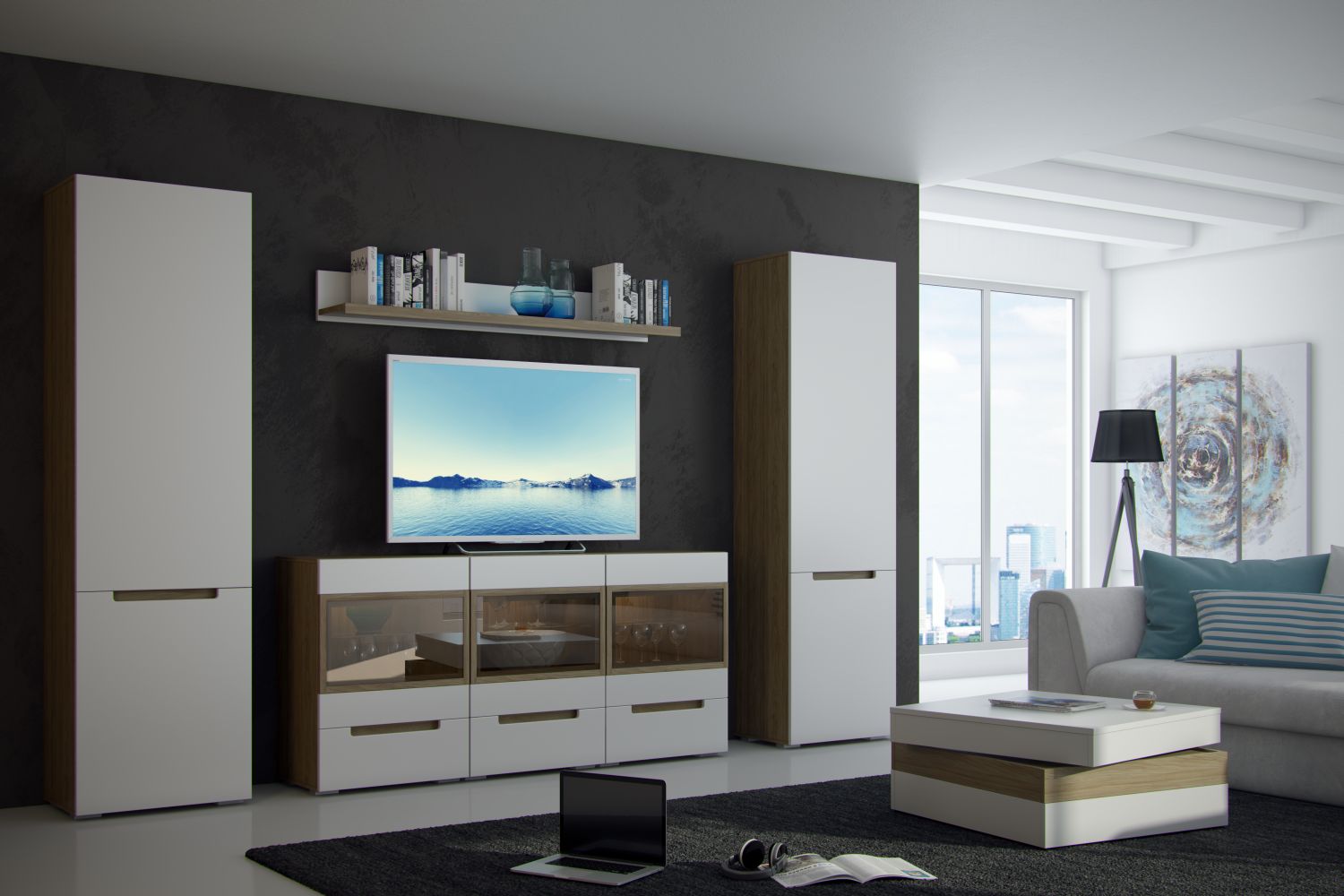 Гладкие поверхности, застекленные дверцы зрительно расширяют пространство. На настенной полке можно разместить книги, декоративные элементы. Два платяных шкафа предназначены для хранения текстиля, одежды, подойдут для размещения домашней библиотеки. Высокая ТВ-тумба снабжена выдвижными ящиками, отсеками с распашными дверцами и стеклянными вставками. Стекло, созданное по инновационной технологии StopSol, скрывает содержимое при обычном освещении и подчеркивает наполнение шкафов при включении подсветки. Качественная фурнитура, надежные механизмы упрощают эксплуатацию и продлевают срок службы комплекта.