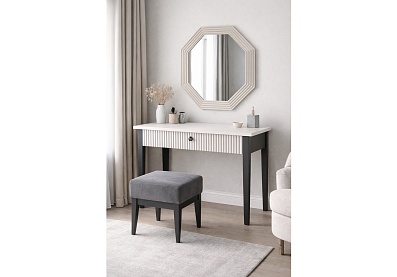 • Для хранения в спальне есть большой шкаф с зеркалом элегантного пепельного оттенка «графит», что придаёт дополнительный шарм коллекции;