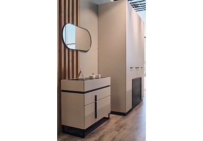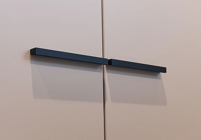 Все модули гармонично сочетаются друг с другом. Черный акцентный мрамор добавляет коллекции изысканности и роскоши, а выразительная геометрия тонких черных ручек на фасадах, перетекающая в линию опор, придают ей современный вид.