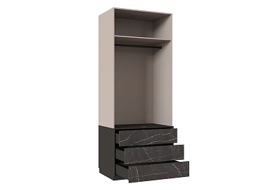 - Корпус выдвижных ящиков с фасадами Кашемир серый выполнен из ЛДСтП 16 мм в цвете Кашемир серый, а с фасадами под черный мрамор — в цвете Черный графит;
