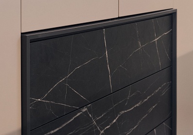 - Темные вставки на ящиках шкафа, столешницы тумб и комодов из ЛДСтП 16 мм черного цвета с имитацией рисунка мрамора;