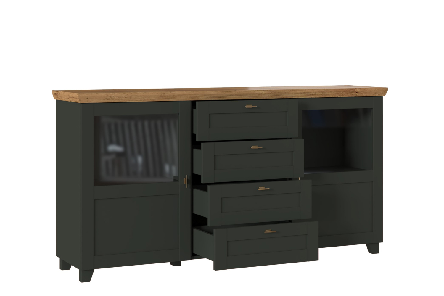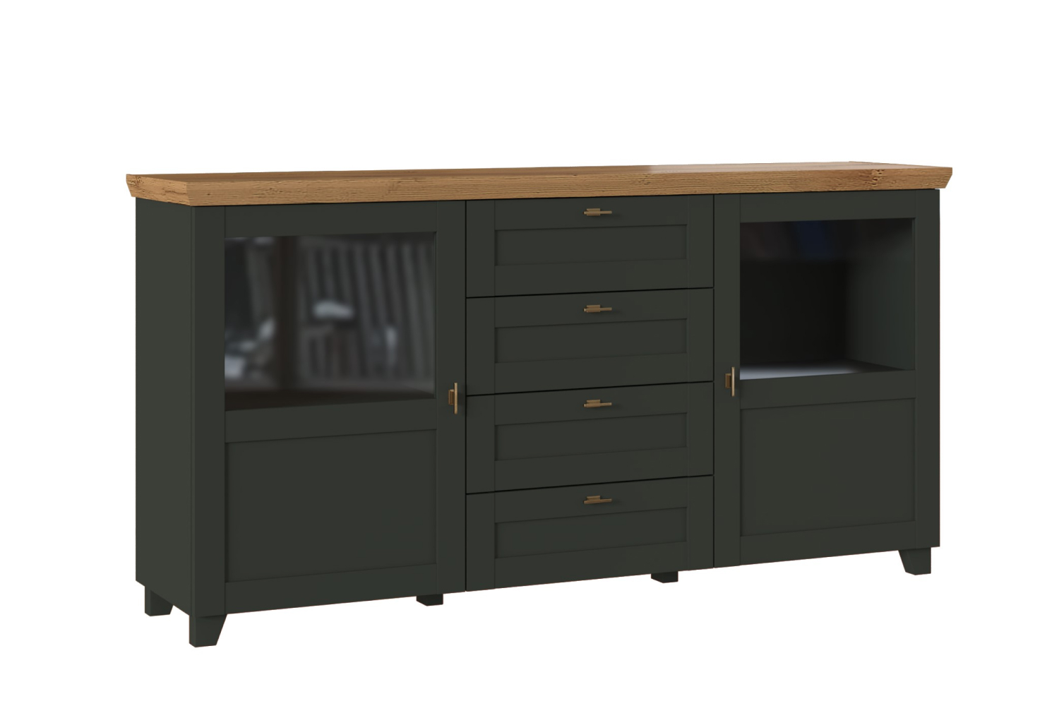 - Комод на деревянных опорах с 4-мя выдвижными ящиками и 2-мя распашными фасадами;