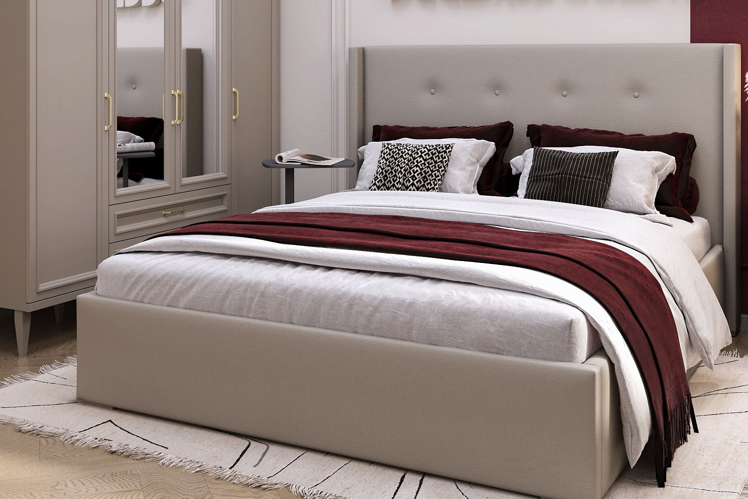 - Детали кровати обтянуты тканью Avelina (9534), изголовье декорировано пуговицами;