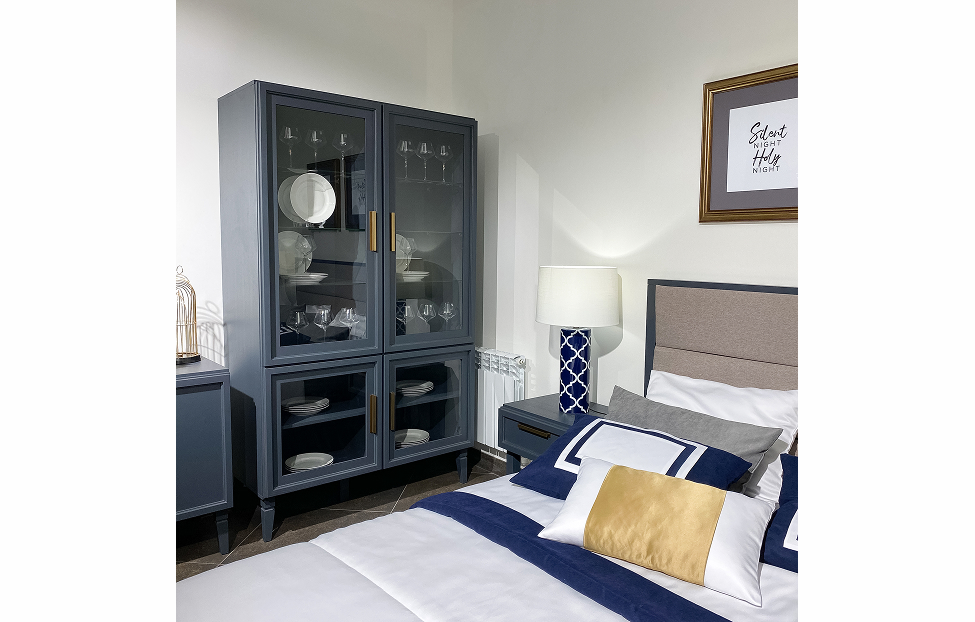 - Два отделения со шпонированными внутренними полками, за двумя распашными стеклянными дверцами в нижней части. И по умолчанию оснащен 6 стеклянными полками в верхней части шкафа;